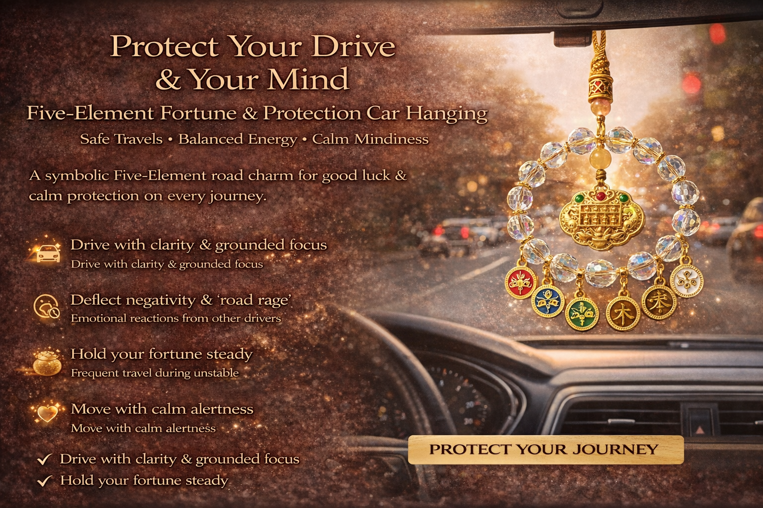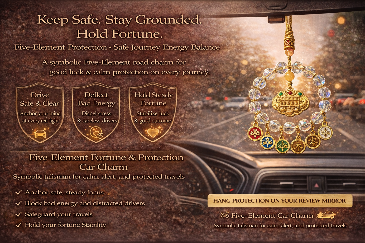 This Five-Element Fortune & Protection Car Hanging is designed as a protective energy charm for your vehicle, inspired by traditional Five-Element balance philosophy and crafted to bring calm, protection, and steady fortune wherever the road takes you.